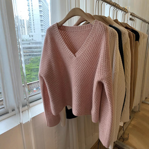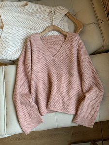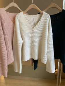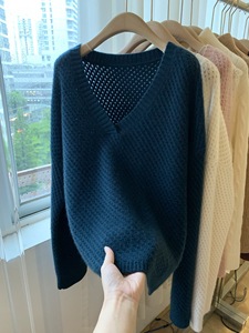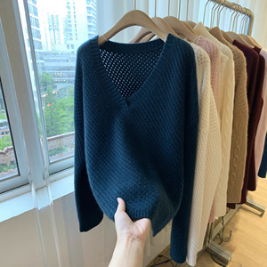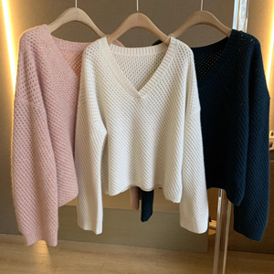 2025秋季新款简约慵懒风V领长袖钩花纯色针织衫批发