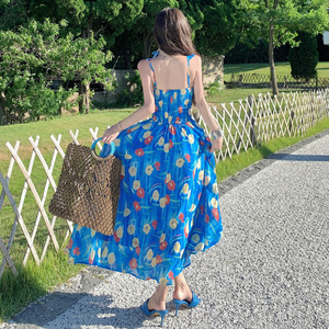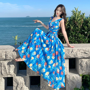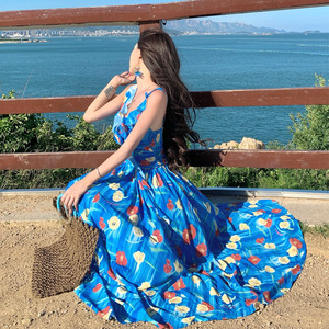 海边绝美度假连衣裙多巴胺蓝色碎花吊带裙女夏收腰大裙摆沙滩长裙