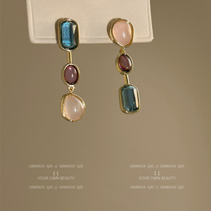 法式复古彩色宝石不对称撞色耳环轻奢小众网红同款耳钉耳饰小众