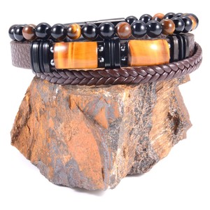 跨境热卖虎眼石黑曜石黑玛瑙圆珠不锈钢磁扣皮革编织时尚通勤手镯