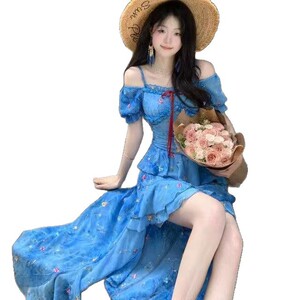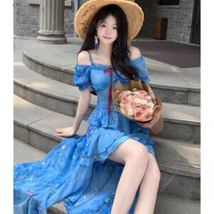 法式气质海边度假连衣裙子女夏2025新款蓝色碎花不规则设计感长裙