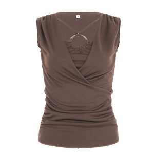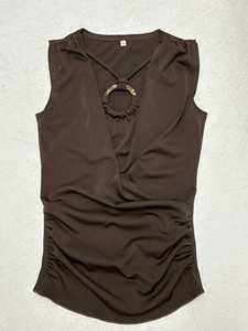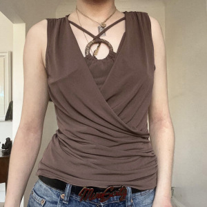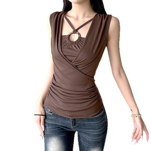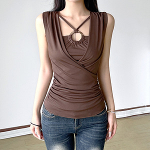美式复古棕色交叉镂空金属扣拼接修身背心轻熟百搭收腰无袖T恤女
