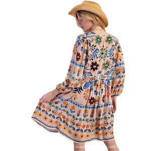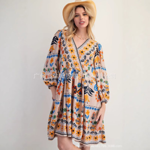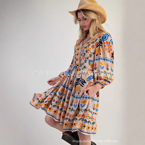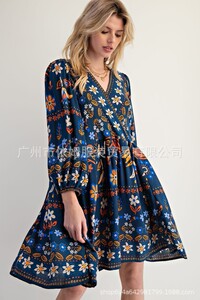亚马逊25秋季新款跨境欧美女装印花V领宽松休闲短款长袖连衣裙女