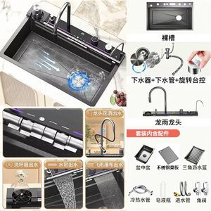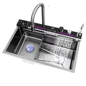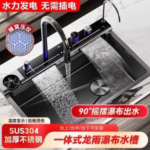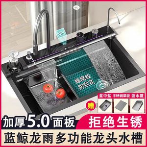 蓝鲸龙雨304不锈钢5MM家用大单槽厨房飞雨瀑布数显多功能蜂窝洗菜
