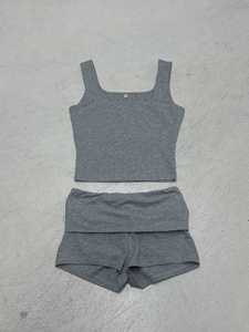美式街头简约休闲运动风纯色背心短裤套装方领背心翻腰短裤两件套