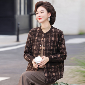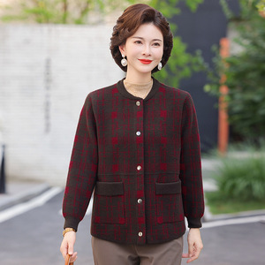 中老年女装洋气格子韩国绒女开衫上衣2025年妈妈秋冬装针织衫外套
