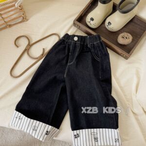 2025儿童牛仔裤秋款男女宝宝阔腿裤条纹翻边卡通印花中裤