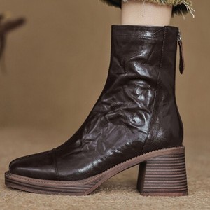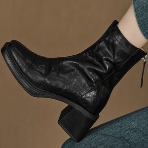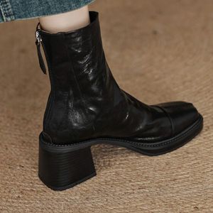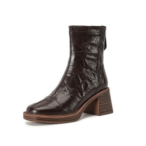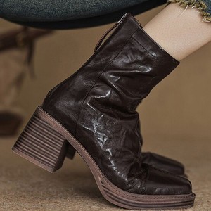 法式复古手抓纹方头粗跟短靴子女2025秋冬新款时尚厚底高跟马丁靴