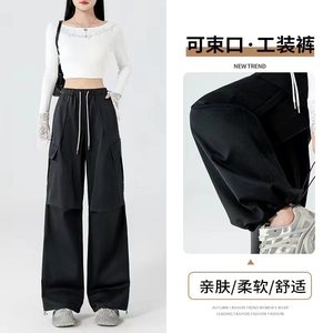 新款工装裤女美式阔腿裤伞兵宽松高腰裤休闲运动拖地直筒秋装裤女