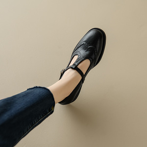 复古雕花T字带玛丽珍鞋女春2025布洛克小皮鞋英伦真皮乐福鞋