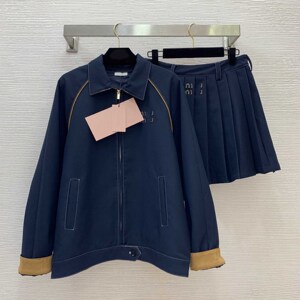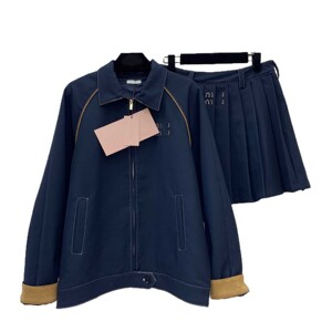 早秋新款拼撞鹿皮绒条设计翻领夹克外套+撞色线压褶短裙套装