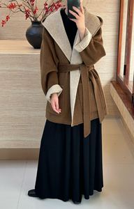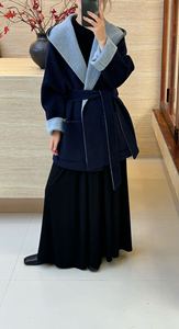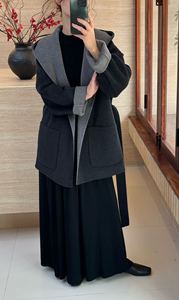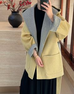 2025韩版Ab面拼色短款秋冬连帽系带宽松口袋双面羊毛大衣女外套