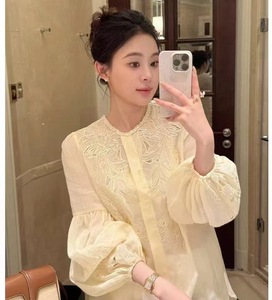 2025新款南油高品质女装 长袖蕾丝刺绣衬衫 设计感拼接圆领上衣