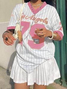 跨境2025欧美运动风辣妹美式复古球衣宽松街头V领短袖T恤上衣百搭