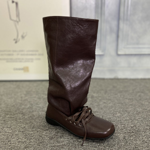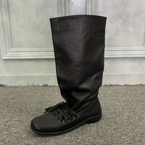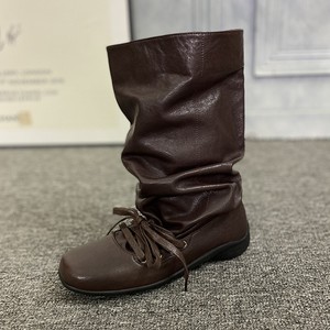 真皮复古西部堆堆靴女欧洲站2025芭蕾舞绑带褶皱中筒靴套筒瘦瘦靴