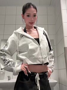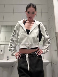 美式复古趣味图案长袖连帽卫衣女春秋设计感宽松气质休闲百搭外套