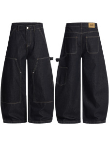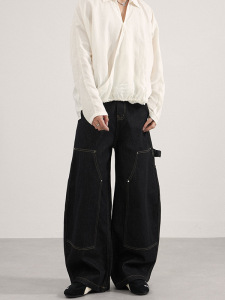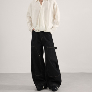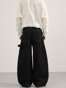 LKTM男装 复古原牛黑色双膝伐木工装裤男女宽松设计感弯刀牛仔裤