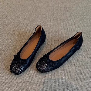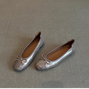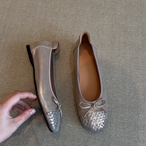 现货复古真皮圆头浅口蝴蝶结法式百搭编织软底平底奶奶鞋单鞋