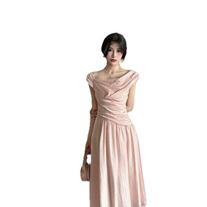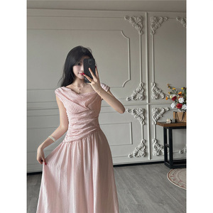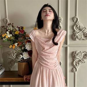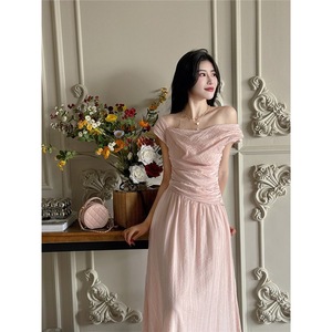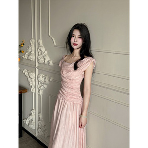 法式温柔高级感纯色一字领收腰显瘦连衣裙粉色长裙女夏季新款