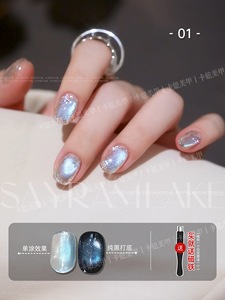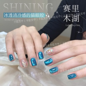 美甲新款海蓝色猫眼甲油胶套装爆闪清透显白玻璃珠子美甲穿戴甲专用