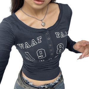美式街头复古字母印花V领单排扣修身长袖T恤辣妹初秋显胸百搭上衣