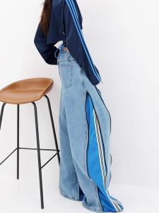 高个子潮流拼接撞色牛仔裤女夏小众设计拉链阔腿裤