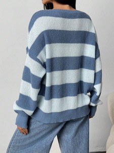 跨境欧美2025秋冬新款时尚百搭毛衣女宽松休闲圆领条纹拼色针织衫