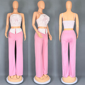 跨境欧美设计感女装条纹立体花抹胸吊带背心直筒长裤两件套装5819
