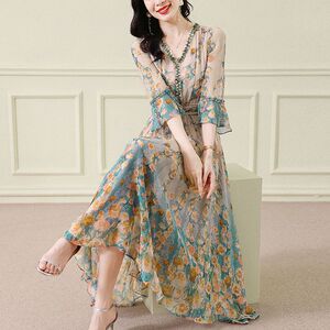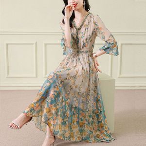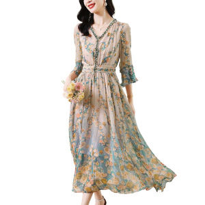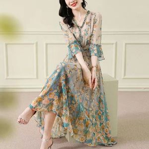 七分袖V字领雪纺连衣裙女2025夏季新款气质名媛法式收腰碎花长裙