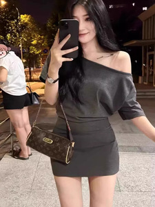 小个子收腰灰色斜肩包臀裙子女夏季新款纯欲辣妹风露肩连衣裙