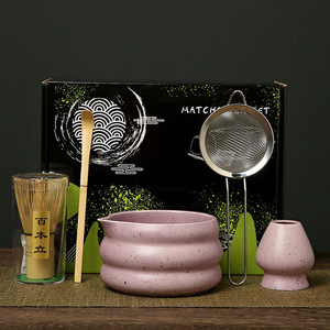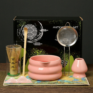 凸纹碗粉色沙点抹茶碗7件套+黑彩盒