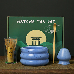 凸纹碗蓝色沙点抹茶碗4件套+月彩盒