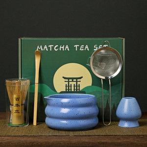 凸纹碗蓝色沙点抹茶碗5件套+月彩盒