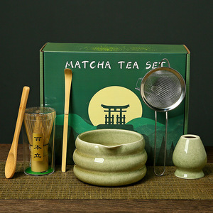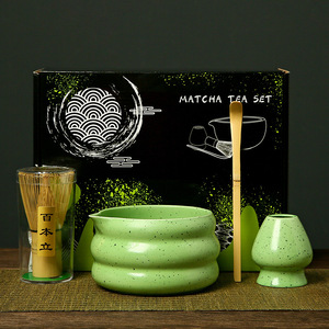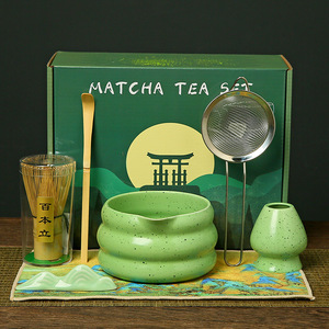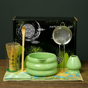 凸纹碗绿色沙点抹茶碗7件套+黑彩盒