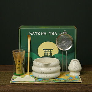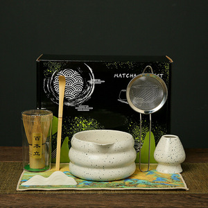凸纹碗抹茶色沙点抹茶碗7件套+黑彩盒