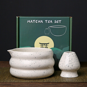 凸纹碗白色沙点抹茶碗5件套+黑彩盒
