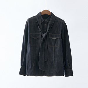 【柜货同源】BC棉口袋钉珠显瘦蝴蝶结系带翻领牛仔衬衫衬衣外套女