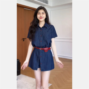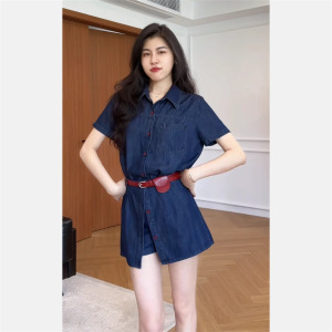 【两件套】深蓝色衬衫+深蓝色裤裙