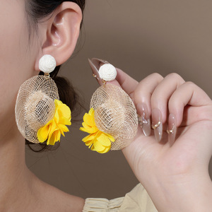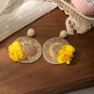 波西米亚草帽度假耳环手工编织拉菲草高级感夸张花朵个性甜美耳饰