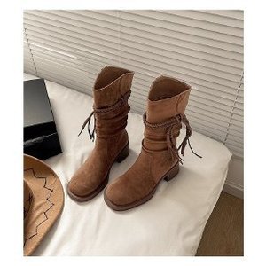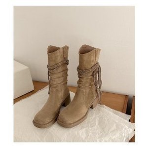 复古废土风流苏骑士靴粗跟不过膝长筒靴显瘦堆堆中筒靴女