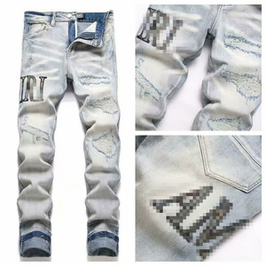 高版AM外贸风格朋克复古蓝破洞修身弹力印花印染小脚男式牛仔裤潮