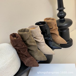 高端2025秋冬新款真皮尖头英伦风复古褶皱高跟显瘦中筒靴时装单靴