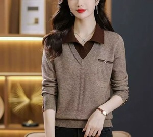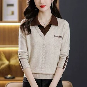 针织衫秋冬季假两件时尚毛衣女翻领秋冬新款洋气宽松针织打底上衣