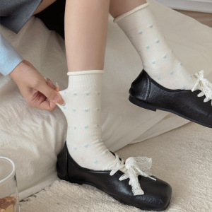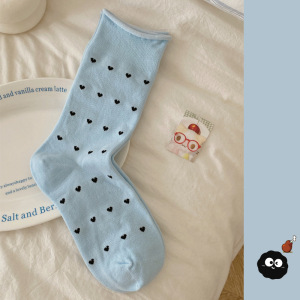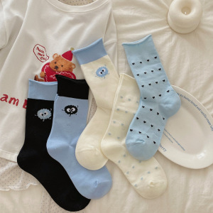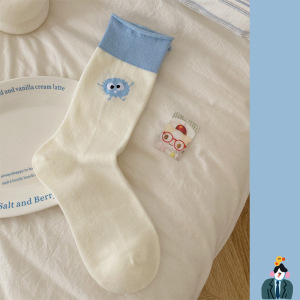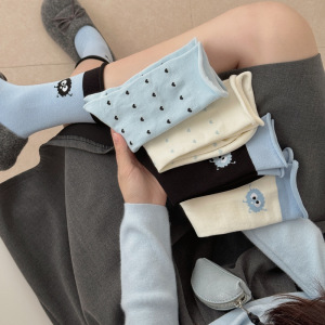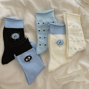 韩国袜子女卡通小煤球中筒袜2025秋季新款拼色卷边堆堆袜蓝白色系