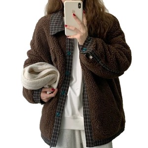 复古格子拼接仿羊羔毛外套女秋冬季新款韩版宽松双层加厚棉服上衣