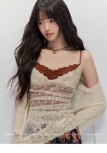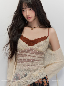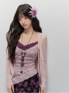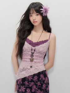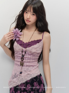 绝美漂亮度假风树莓紫色假两件蕾丝带胸垫吊带背心女外穿无袖上衣