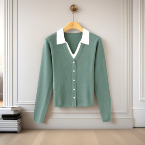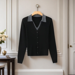 Polo领套头毛衣女2025春秋感假两件简约拼色显瘦外穿针织上衣