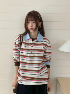 GAGD 条纹撞色polo衫宽松M*U系长袖T恤 2025秋季休闲百搭上衣女