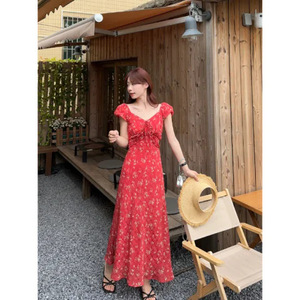 夏日纯欲气质碎花泡泡袖V领连衣裙2025新款显瘦超好看漂亮长裙女