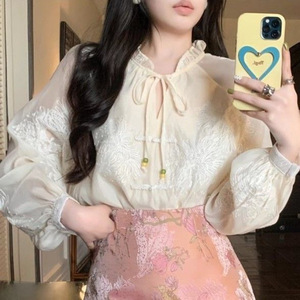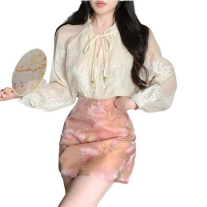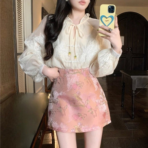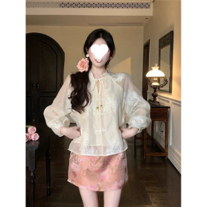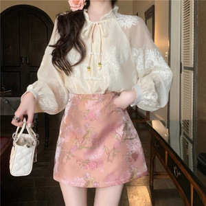 大码新中式国风刺绣衬衫女秋装胖mm夏季半身裙两件套宽松显瘦